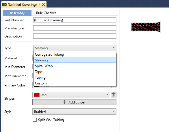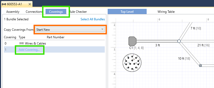 To add a covering to your Harness, select the Coverings tab, and select one or more bundles in your Harness Top Level. From here, you can simply click “Add Covering…” (shown in green). For additional bundles, you can simply select an existing configuration to save time (shown in orange).