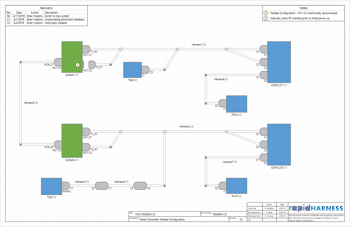 Systems are used to model electrical schematics connecting one or more Harnesses and Devices. Systems show how Harness and Devices are mated, and model a complete path of electrical conductance (Nets).