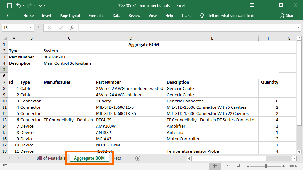 The Aggregate BOM is used to create a complete Bill of Materials that describes all components used within a System (summing together totals from all constituent Harnesses).